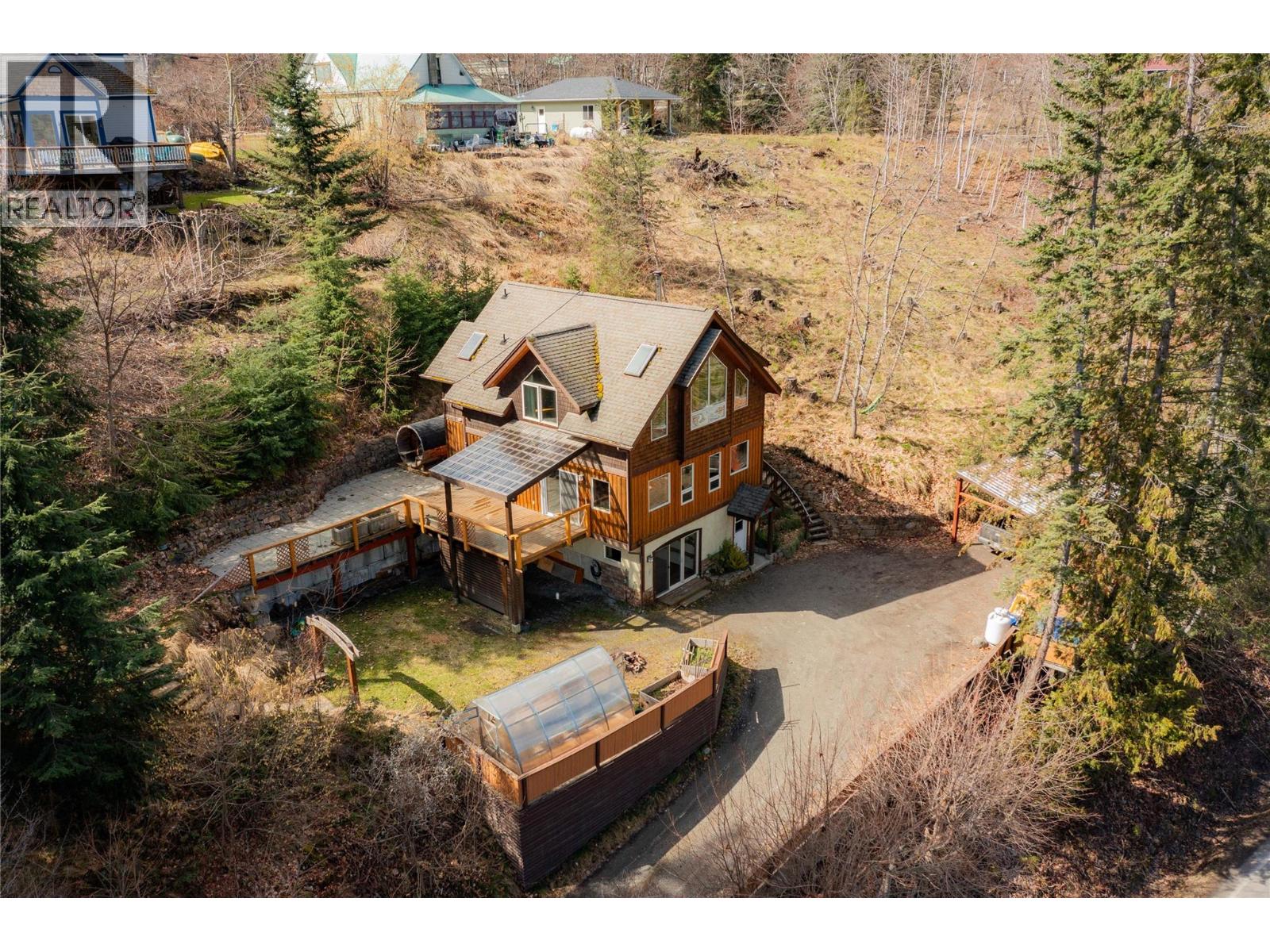 Perched above Kaslo Bay, this hybrid timber-frame home captures sweeping views across Kootenay Lake and the Purcell Mountains. Set just above the village, the elevation provides remarkable scenery and privacy while keeping you minutes from Kaslo’s waterfront, shops, and restaurants. Designed to take full advantage of the setting, the home offers over 2,300 sq ft across three levels, with large windows, warm wood finishes, and multiple outdoor spaces to enjoy the lake and mountain views. The main level features an open-concept living, dining, and kitchen area anchored by a propane fireplace, creating a welcoming space for everyday living or hosting friends and family. The entry level includes a spacious foyer with wood stove, laundry area, storage, and a flexible guest space with its own bathroom—ideal for visitors, extended family, or short-term rental potential. Upstairs, the top floor offers a private primary suite with ensuite, an additional bedroom, and a loft-style sitting area that works beautifully as a home office or reading retreat. Outside, low-maintenance landscaping, garden areas, and a generous deck create inviting outdoor living spaces, with room to relax, entertain, or simply take in the ever-changing lake views. Whether as a full-time home, recreational base, or part-time residence with rental potential, this property offers a comfortable foothold in one of the most scenic corners of the Kootenays. (id:4069)